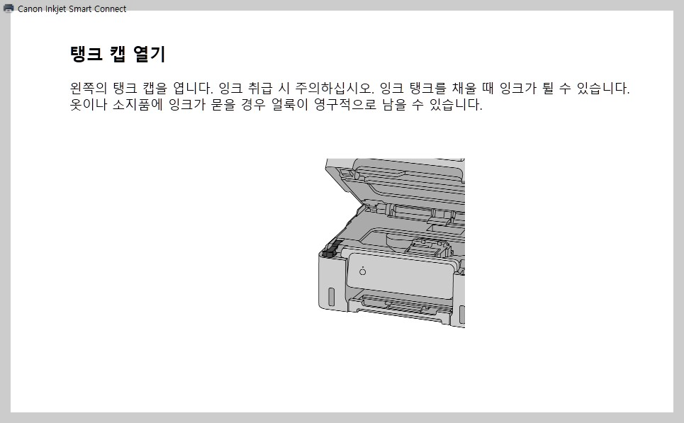프린터기 좌측에 위치한 탱크 캡을 열어준 후 블랙 잉크를 주입하면 됩니다.